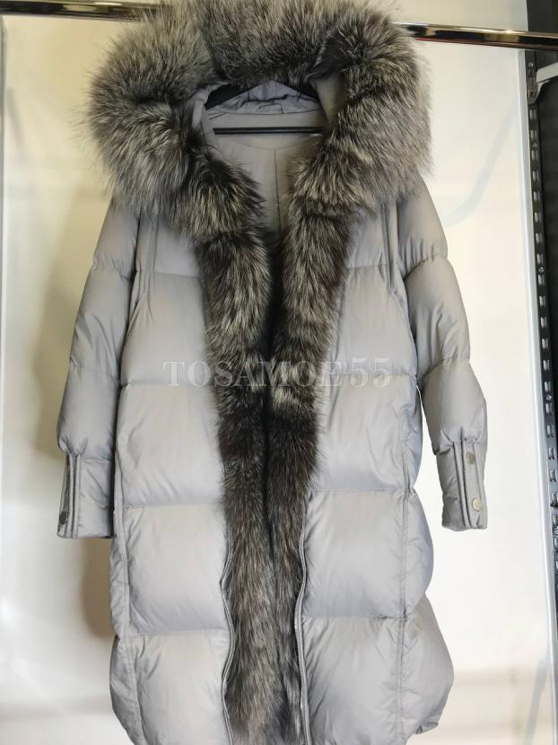 Длинный серый пуховик с чернобуркой