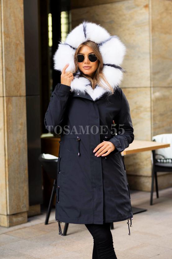 Парка чёрного цвета с белым мехом песца