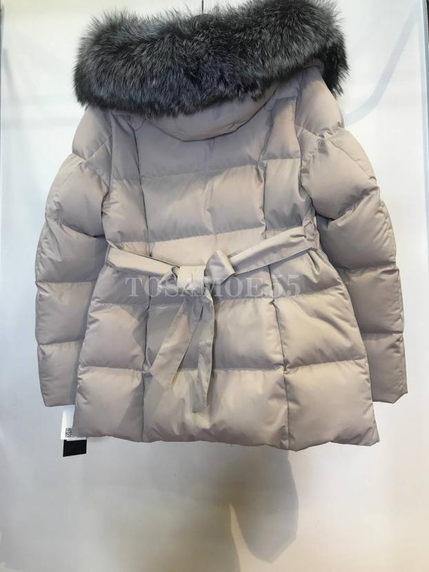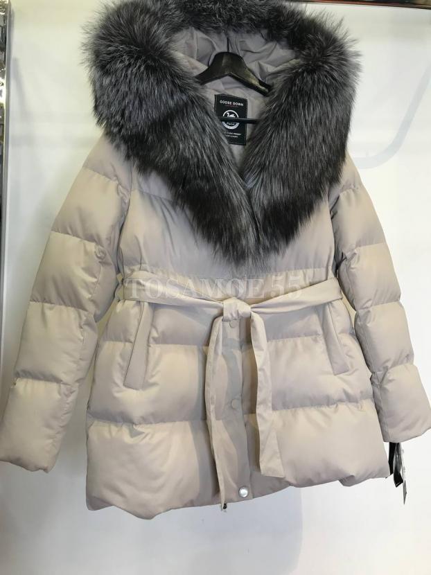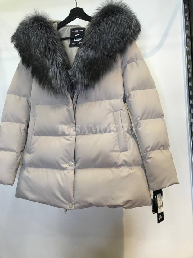 Светло-серый короткий пуховик с чернобуркой